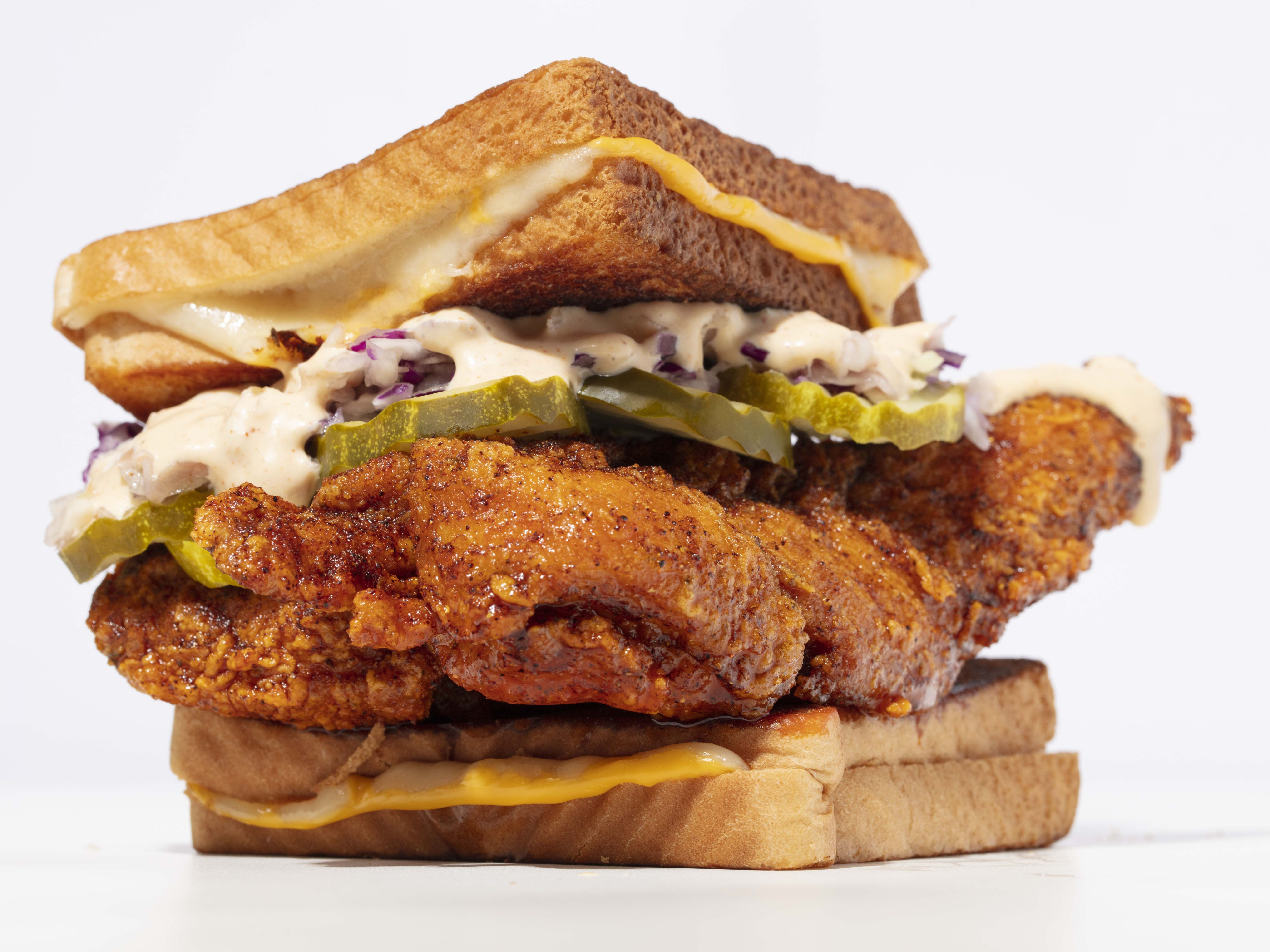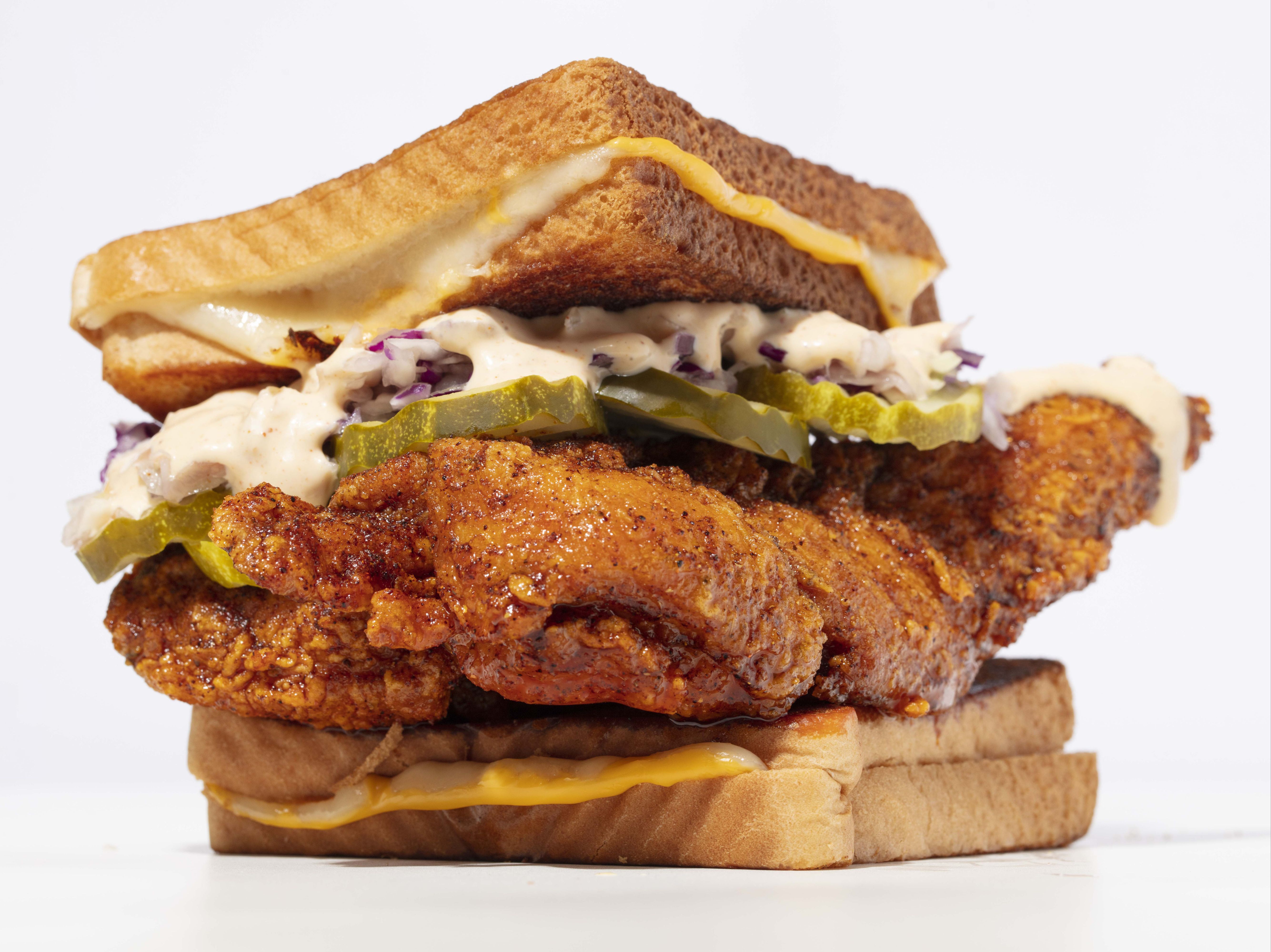 The Cheesy Baba is a Baba's Chicken Sandwich made with two Grilled Cheese sandwiches instead of brioche buns.