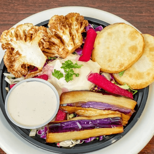 Fried cauliflower, garnished with lettuce, tomatoes and pickles, topped with tahini sauce. (Not Gluten Free)