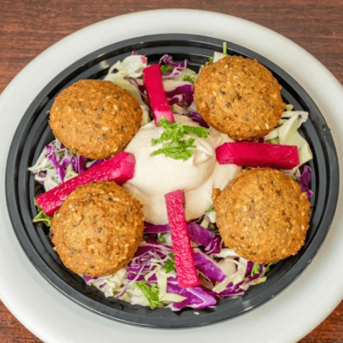 Falafel bowl consists of Rice, Cabbage and Parsley Mix, 4 Pieces of falafel, 2oz hummus, and pickles