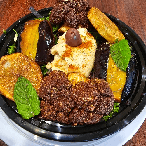 Fried eggplant, cauliflower, and potatoes garnished with lettuce, tomatoes, parsley, and pickles, topped with tahini sauce. (Not Gluten Free)