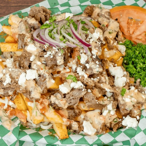 Seasoned fries topped with Mozzarella cheese, feta cheese, tomatoes, onions, parsley, Beef shawarma and drizzled with our famous spicy tahini sauce