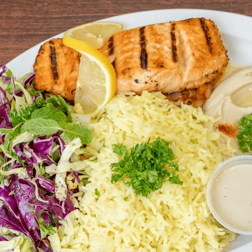 Salmon filet sauteed with onions, tomatoes and lemon, served with salad, rice, pita bread and Tahini sauce