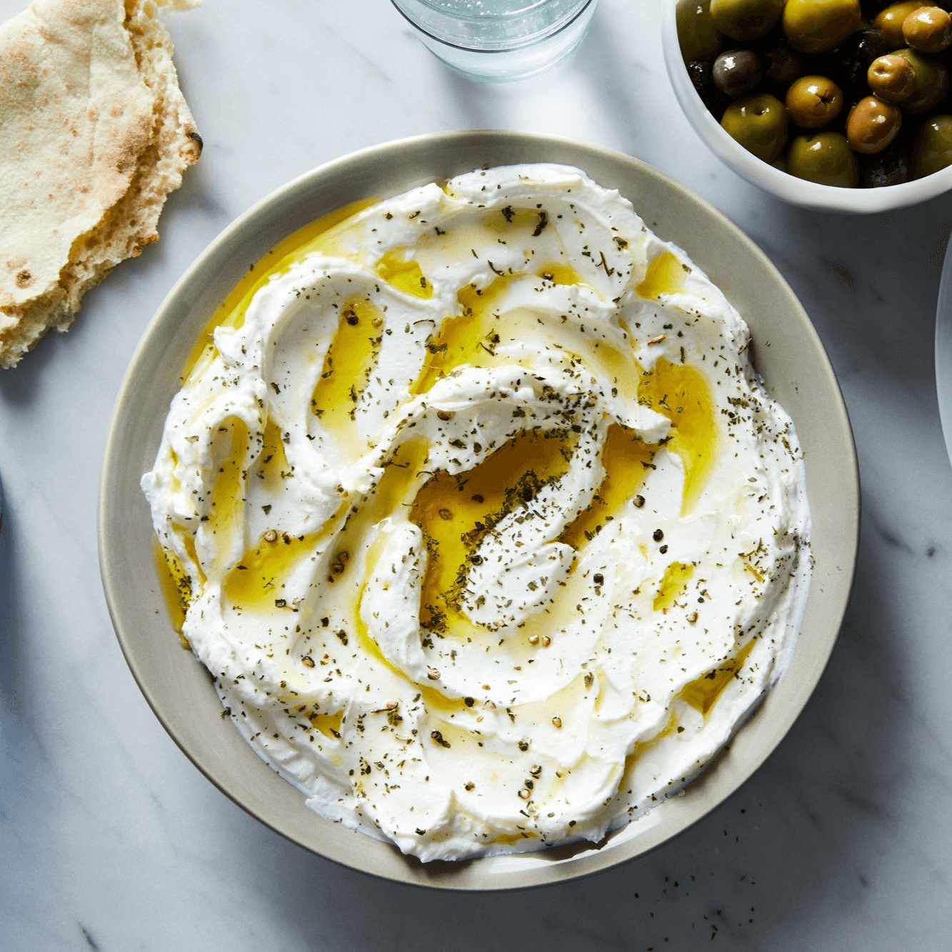 Yogurt Cheese Labneh, drizzled with olives oil and paired with 2 pita breads