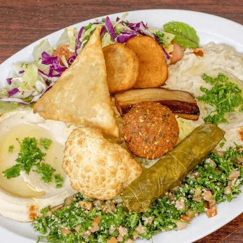 Falafel, Potato, eggplant, cauliflower, grape leaf, veggie sambuusa, hummus, baba ghanoush, rice and pita bread, served with tahini sauce on the side