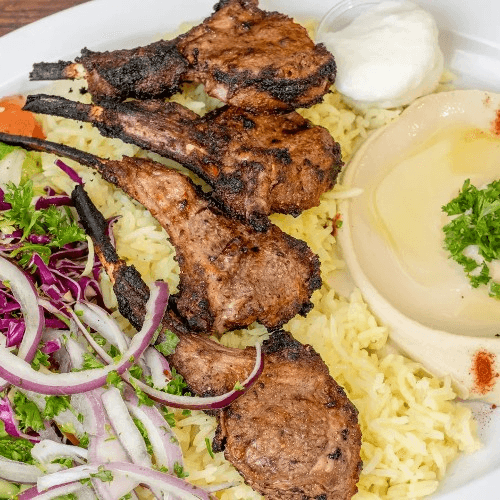 Lamb Chops served with rice, house salad, hummus, pita bread and garlic sauce