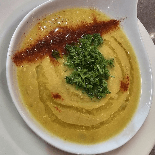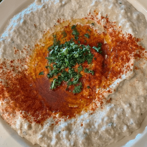 Hummus Mixed with Finley chopped parsley, tomatoes, lemon and onion. Garnished with extra virgin olive oil and paprika and served with 2 pita breads