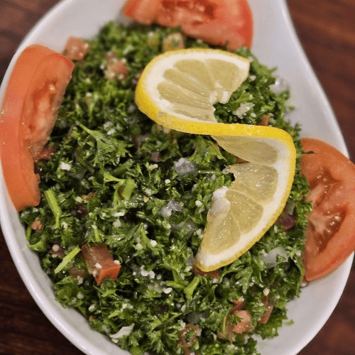 Finely chopped parsley, tomatoes, onions, lemon and mixed with bulgur wheat and dressing.